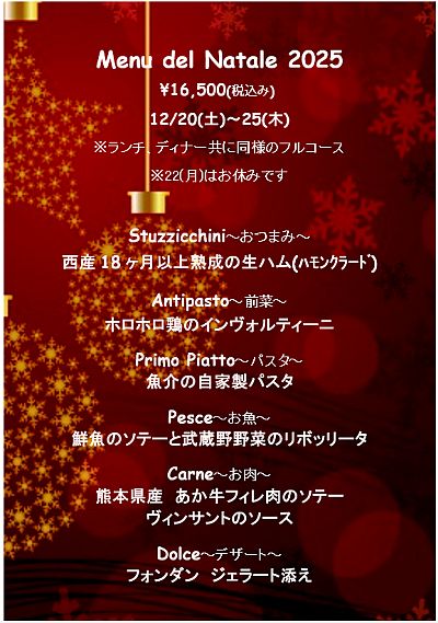 の期間(昼,夜共に)のコースメニューは全てクリスマスコースのご用意です。